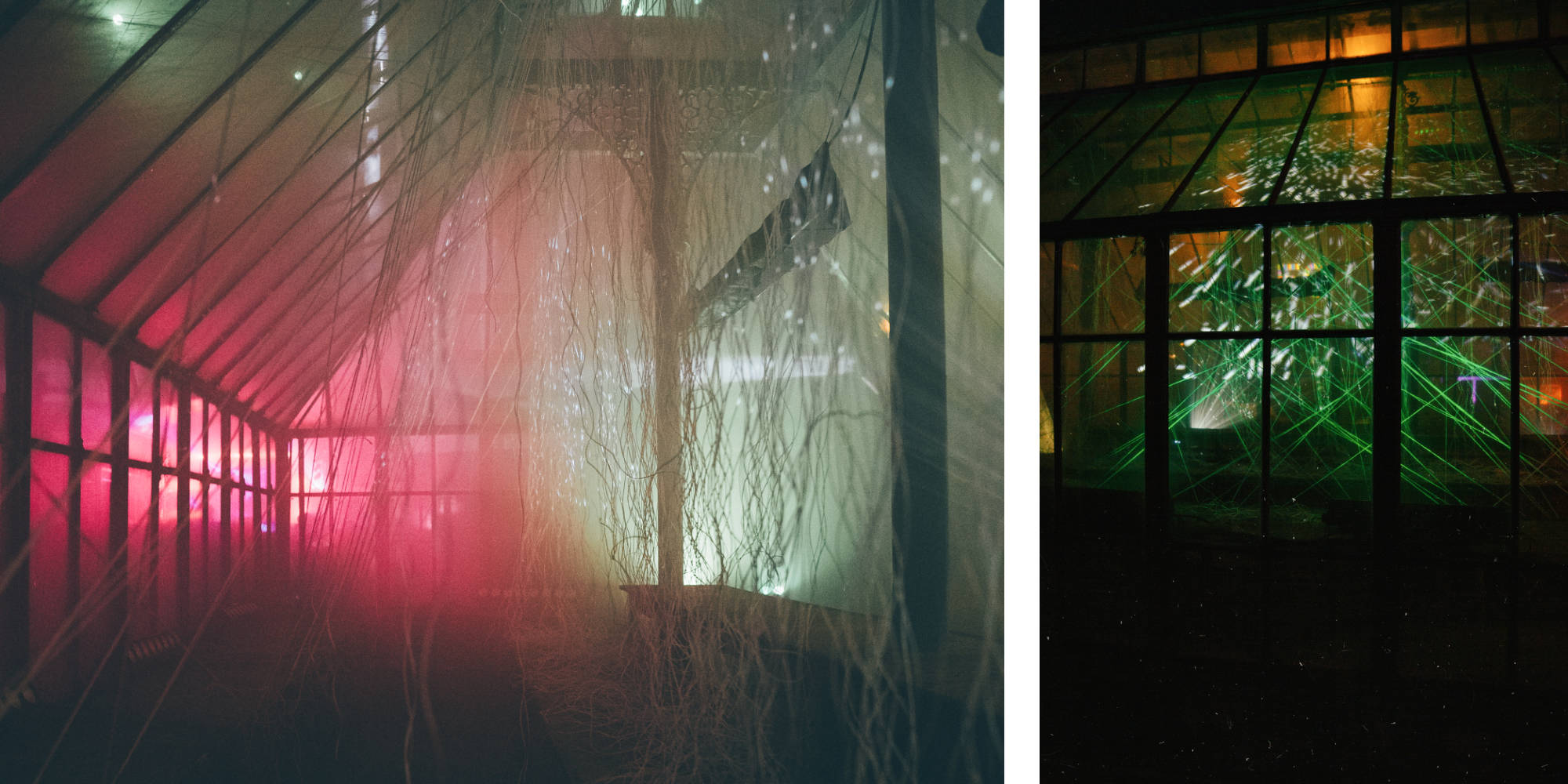 Myths of lost gardens, such as the Garden of Eden, the Hanging Gardens of Babylon, and the Celtic Otherworld, focus on themes of paradise, human longing, and the loss of harmony with nature. These stories often reflect human mistakes—such as disobedience or pride—and remind us of a perfect past that can never fully be recovered.In this installation, inside the greenhouse—usually a place where sunlight creates a nurturing environment for plants—artificial light takes over. Industrial materials like electrical cables and laser projections simulate urban light pollution. The laser beams shift as visitors move through the space, symbolizing nature’s ongoing struggle and resilience in the face of human interference. Additionally, instead of real plants, artificial flowers and trees made from industrial materials are used to evoke the memory of a once-thriving garden, now lost.